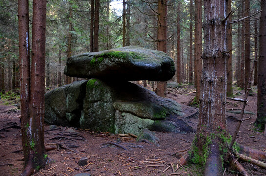 stone boulder a flat and wobbly remnant of glacial processes in a spruce forest. the wobbly stone resembles a dolmen or menhir in a horizontal position. the oldest natural swing