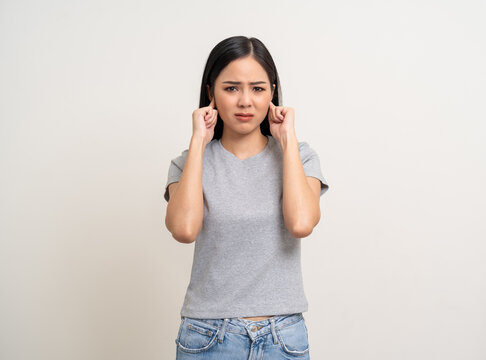 Young Woman stressed and frustrated covering her ears with her hands due to loud noise. Annoyed noise sound pollution. Asian Woman blocking ears