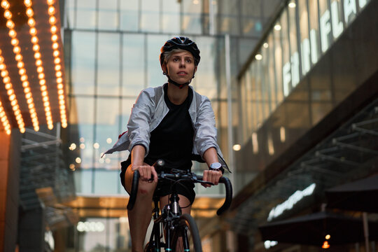 A woman rides a bike through the city streets with the urban landscape in the background