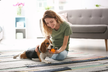 Playful dog lying carpet playing with loving woman close up. Pet having fun home