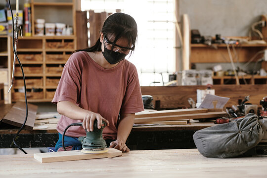 Craftsman and DIY handmade. Female carpenter using electric sander in carpentry workshop, sanding wooden planks