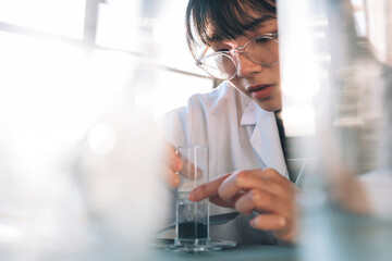 female muslim scientist sitting at table with microscope and looking at glass sample during experiment in chemical laboratory