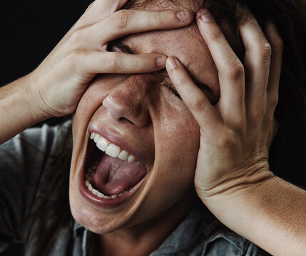 Face, horror and phobia with woman screaming in studio on black background for reaction to fear. Anxiety, mental health and shouting with scared young person in dark for stress, nightmare or terror