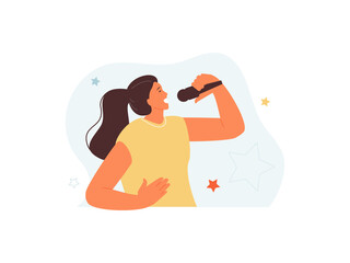 Female musician with a professional retro microphone performs on stage in the dark. A sexy woman in an open shiny dress sings a fast joyful song. Solo concert of the singer. Close up.