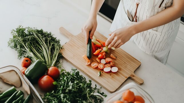 A woman slicing fresh vegetables on a wooden cutting board, preparing healthy vegan ingredients for a meal in a bright kitchen