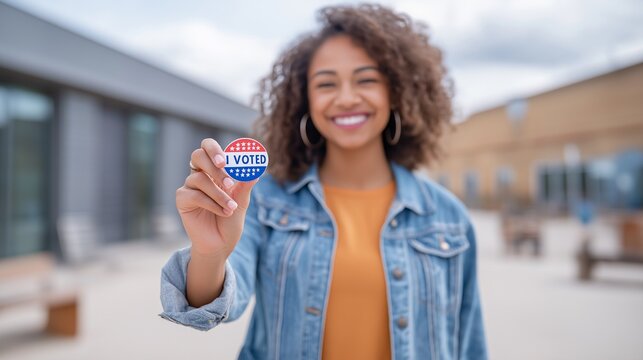 A confident businesswoman in a modern office raises her hand to take an oath or vote, symbolizing integrity, commitment, and active participation