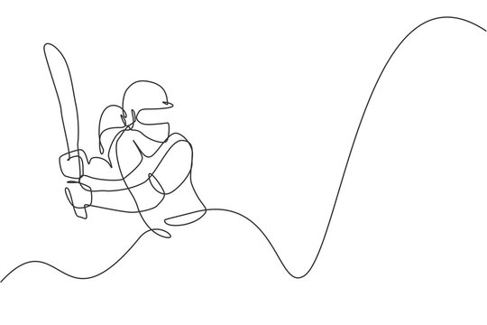 Single continuous line drawing side view of woman cricketer hitting the ball with bat for match or competition. Fitness training, performance or game. One line draw graphic design vector illustration