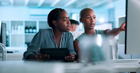 Discussion, computer and team of women scientists in laboratory reading information. Conversation, collaboration and African female researchers work on pharmaceutical science project with technology.