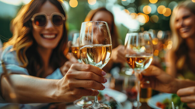 women toasting with glasses of white wine outdoors