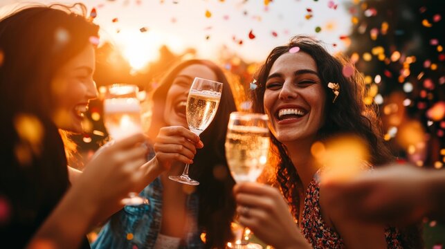 A group of women joyfully toast with champagne flutes amidst colorful confetti, capturing the essence of celebration, friendship, and joy in a lively outdoor setting.