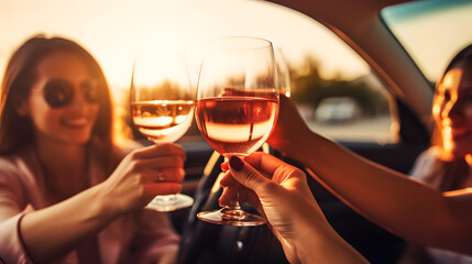 Friends clinking glasses with wine inside the car at sunset