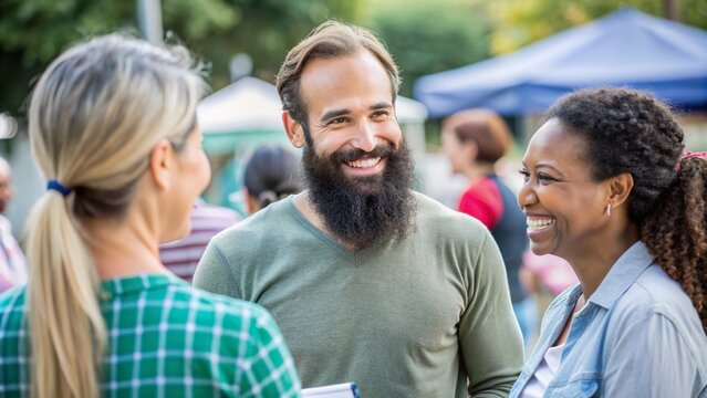 A man with a beard smiles as he talks to two women at a mental health education and support booth at a community event