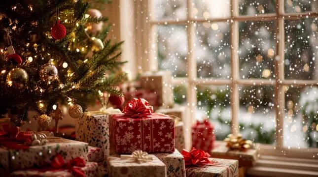 Festive Christmas scene with snow-covered ornaments and blurred bokeh lights