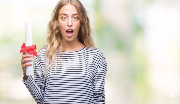 Beautiful young blonde woman holding degree certificate over isolated background scared in shock with a surprise face, afraid and excited with fear expression