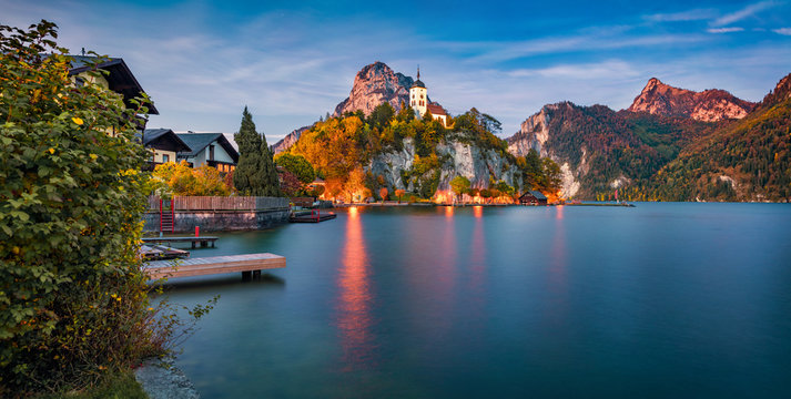 Dramatic evening view of Johannesbergkapelle church. Amazing scene of Traunsee lake. Colorful autumn landscape of Austrian Alps with Traunstein peak on background, Austria, Europe.