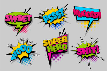 sweet woo shit super hero pop set hand drawn pictures effects template comics speech bubble halftone dot background pop art style. Comic dialog cloud. Idea conversation sketch explosion.