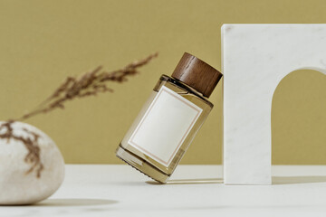 Glass bottles with homeopathic globules on a light green background, copy space, background with herb and flower