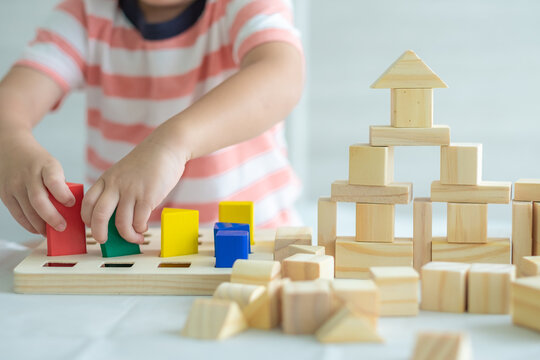 Portrait of kid cute asian boy playing a blocks wood game. selective focus. Copy space. Executive Functions Concept.
