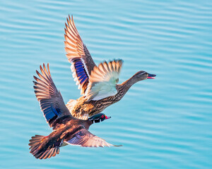 Wood Duck Drake and Mallard Hen in Flight Over Pond