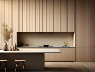 Modern style inspired neutral kitchen with wood panneling. Wood panneling interior. Light blue colors interior.