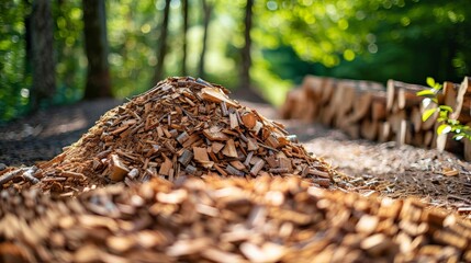 A pile of wood chips rests in a forest clearing, bathed in warm sunlight