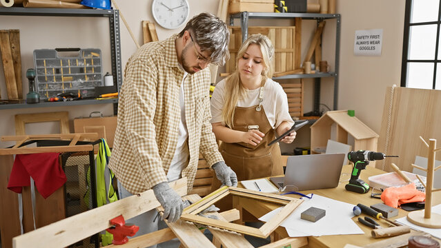A man and woman team working together in a carpentry workshop, surrounded by woodcraft tools.