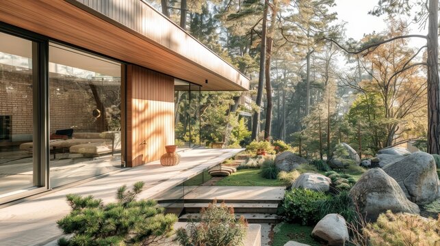Modern house with a wooden facade, large windows, and a patio overlooking a garden with rocks and shrubbery. The house is surrounded by tall trees, indicating a forested or wooded area