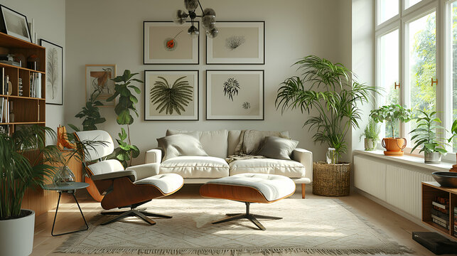 Modern Living Room Design Plants and Sofa Decor, Cozy White Interior with Wooden Accents.