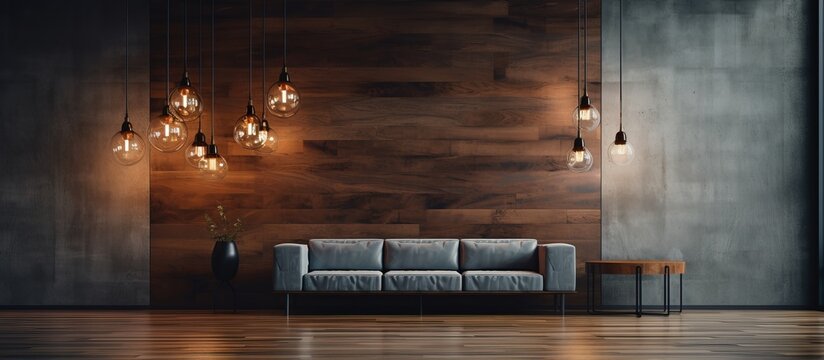 Clean design room with scattered decor, soft wooden accents and copy space on wall