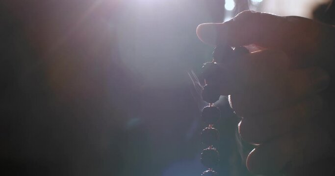 Macro detailed view of fingers counting beads on dark background with backlit smoking incense. Close up hands holding wooden rosary indoors natural light. Religion spirituality meditation concept