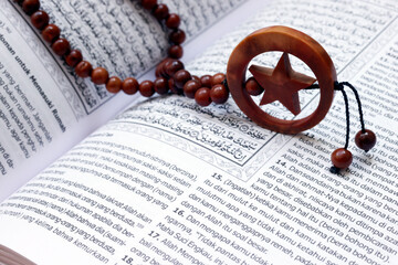 Islamic Holy Book Quran with rosary beads, Ramadan concept, Indonesia