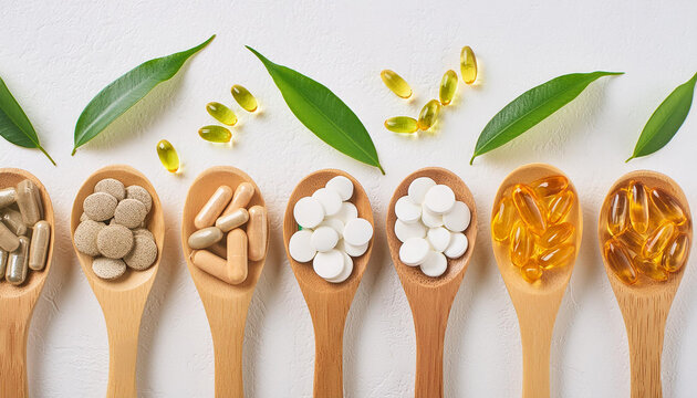 Top view Various Vitamins and pills in wooden spoons with leaves nearby, on a white background.