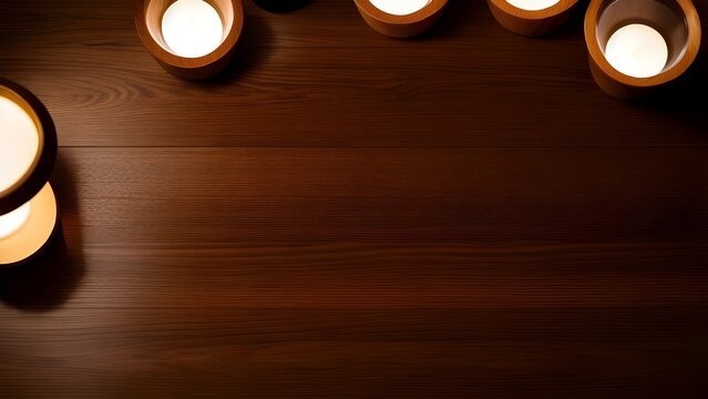 Empty wooden table in front of a blurred night cafe scene  Bokeh lights and plants create a warm ambiance