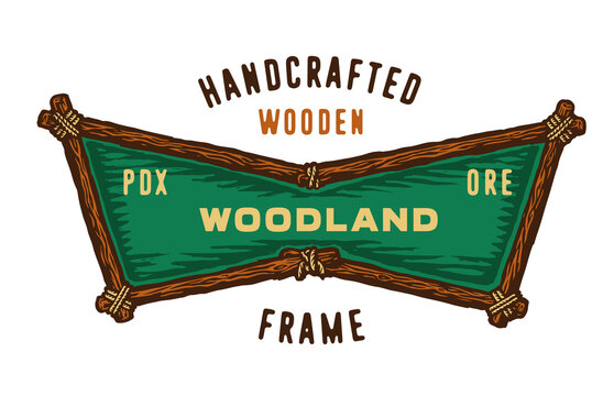 Woodland hand-drawn wooden badge logo. Wood texture frame with copy space. Vintage handcrafted quality. Retro wooden forest camping hiking adventure woods logo emblem design.