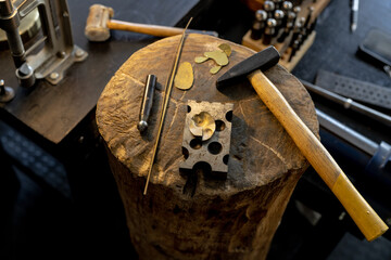 Close up of wooden trunk with tools and materials in jewellery workshop