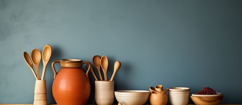 Assorted ingredients and utensils placed on wooden table during cooking process in home kitchen with white wall and minimalistic interior in natural eco friendly style