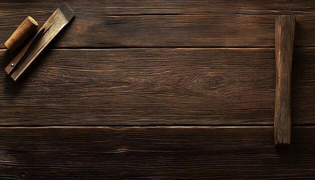 Rustic wooden table in carpenter workshop with wall of blurred woodworking hand tools. Empty workbench surface for carpentry product presentation, mockups, background. Woodcraft DIY, home renovation