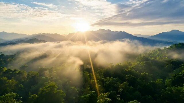 Golden Dawn over Verdant Heights: The sun emerges, its radiant rays breaking through the morning mist to illuminate a breathtaking panorama of towering mountain ranges and lush, expansive forests