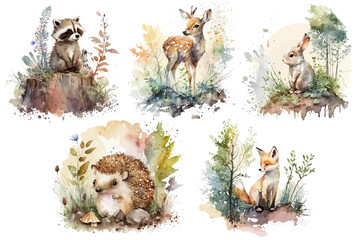 Safari Animal set Rabbit, raccoon, fox, hedgehog, deer in the forest in watercolor style. Isolated. Generative AI