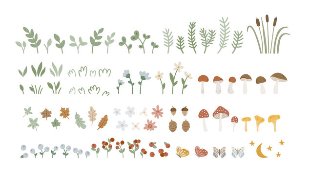 Hand drawn collection with forest elements: herbs, plants, cones, flowers, leaves, mushrooms, grasses, berries. Huge woodland set. Cartoon forest flora. Vector botanical illustration