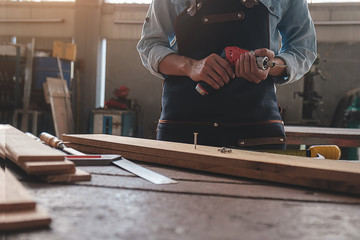 Craftsman building furniture from the wood at workshop table in carpenter wood factory. Crafts design, Design, Creativity, Carpenter and Lifestyle concept.