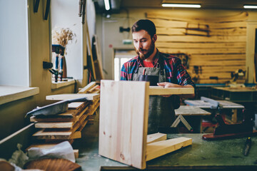 Self employed owner of restoration manufacture creating and repairing wood equipment, experienced man artisan 30s concentrated on improvement decorative handmade chair during working process
