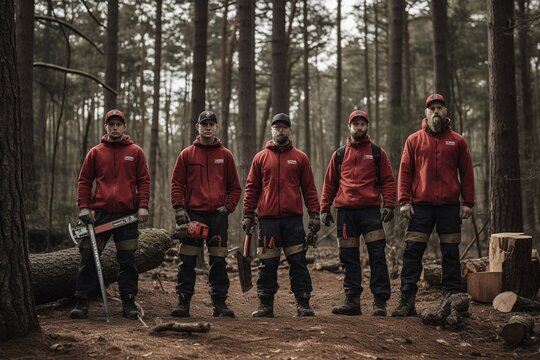 Advertising portrait shot of a woodcutter team standing together in a forest and they look at the camera. Generative AI