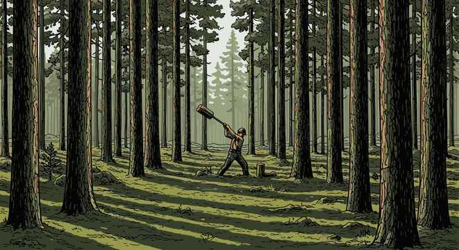A lone woodsman powerfully swings his heavy axe amidst a sun-dappled, ancient forest, demonstrating traditional labor and the raw beauty of nature's embrace.