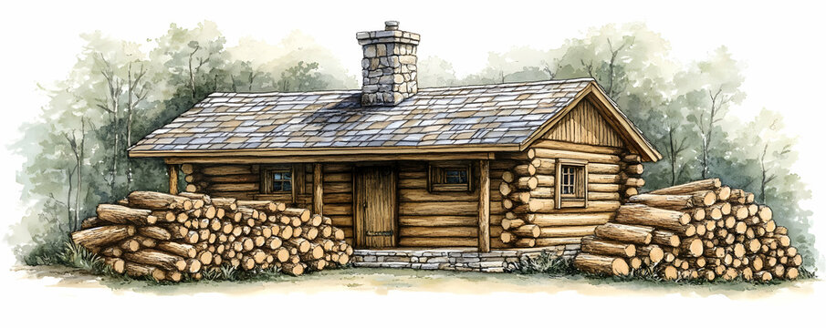 Rustic log cabin, forest setting, woodpile