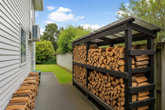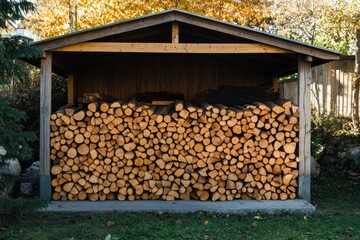 Neatly Stacked Firewood in Woodshed, Ample Fuel for Winter Warmth, Organized Log Storage for Home Heating, Essential Cold Weather Resource, Cozy Winter Preparation