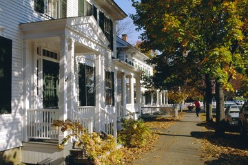 Early autumn foliage scene of farmhouses in Woodstock, Vermont mountains