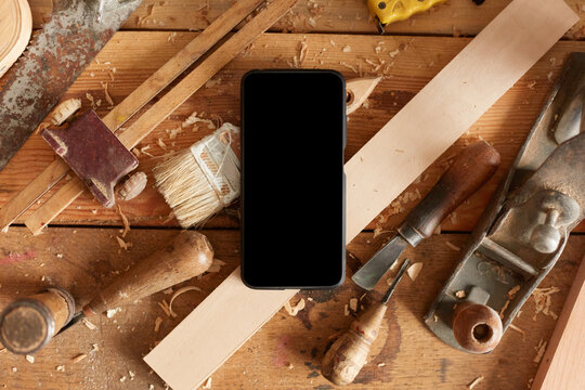 Big variety of equipments on wooden table, lot of tools on table, smart phone with blank screen in carpentry workshop, copy space for advertisement or promotional text.