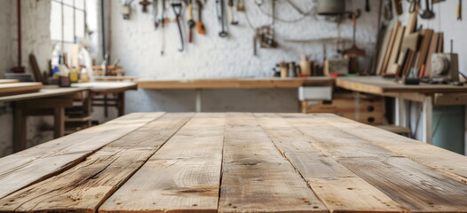 Rustic woodworking table with and blurred wood working tools background for craft and hobby products.