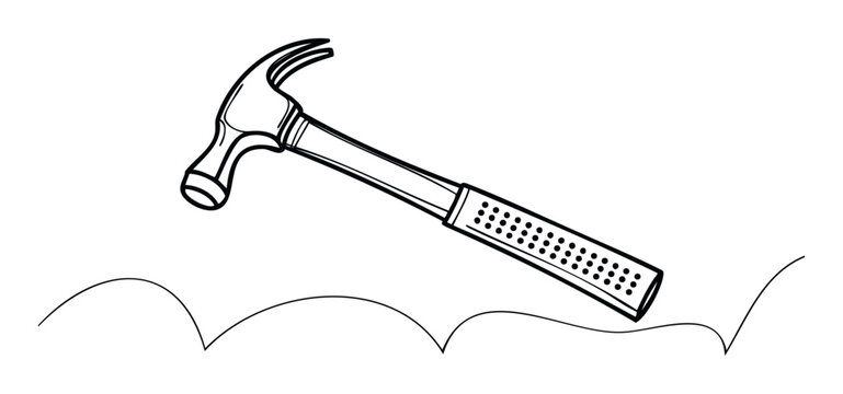 A crisp black and white line drawing of a sturdy claw hammer on a curved line, perfect for handyman services, construction themes, hardware store advertising, and DIY project guides.